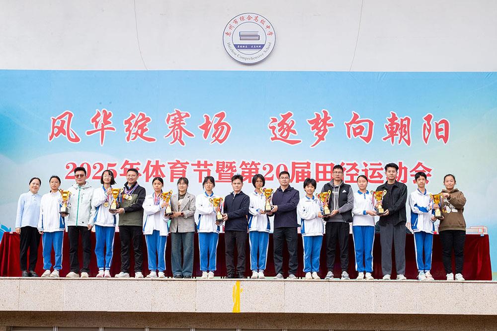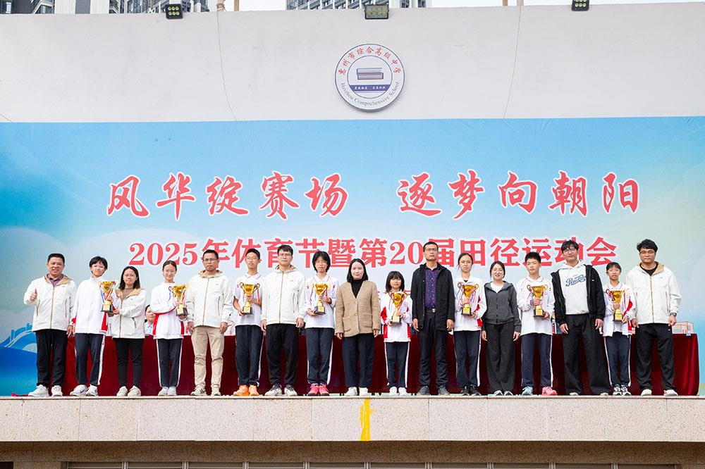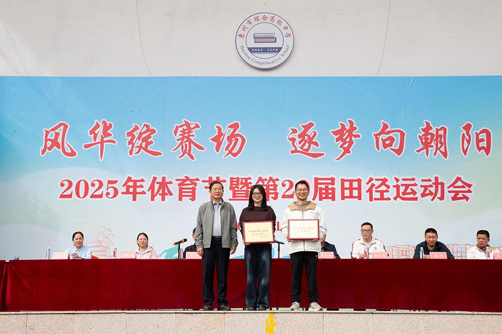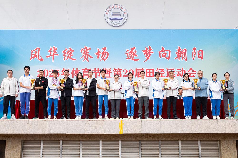 闭幕式上,校领导依次为获奖集体颁奖,表彰他们在本届运动会中的优异表现。奖项涵盖最佳团队、最佳入场式,以及初中部、高中部各年级团体总分前八名等。