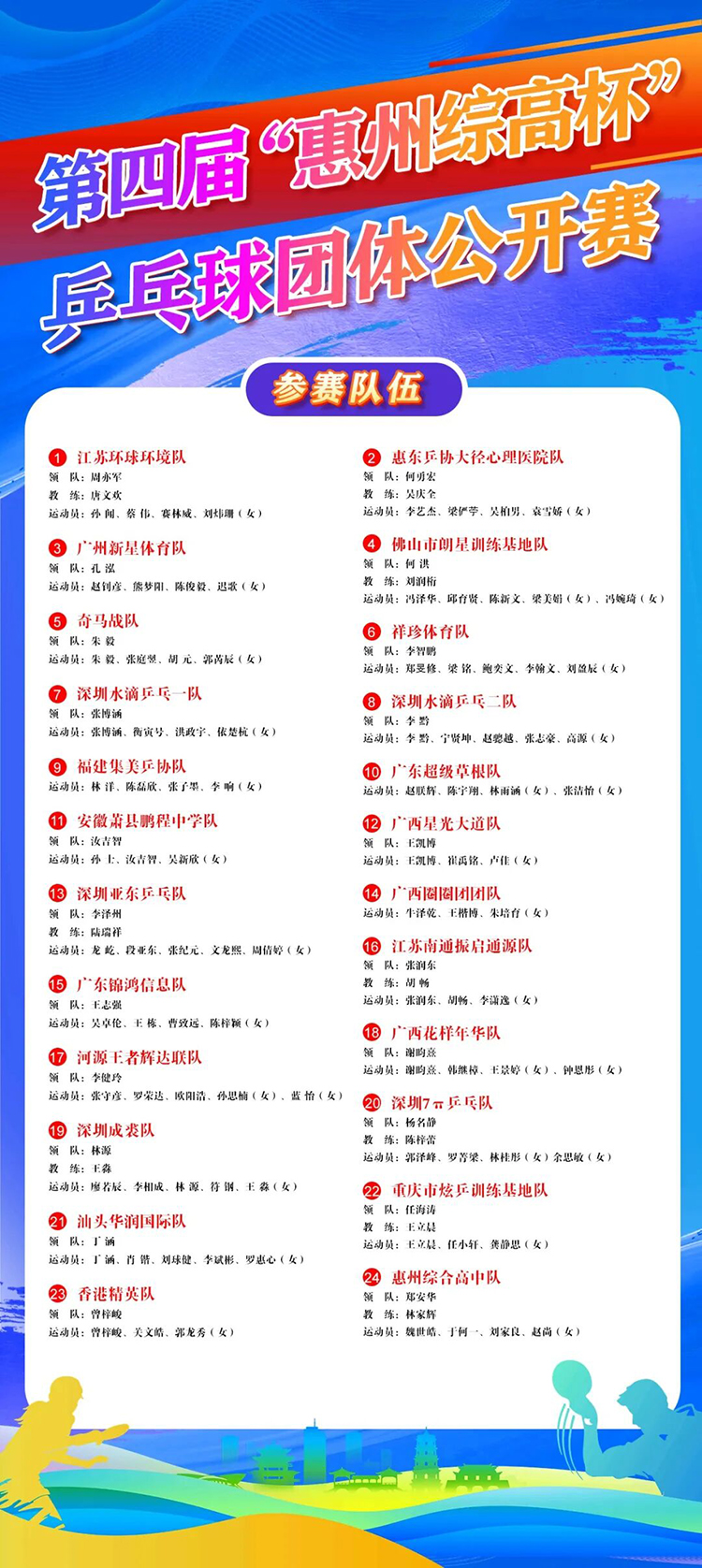 本届团体公开赛共有24支乒乓球队伍参赛。既有惠州本土劲旅,也汇聚了深圳、广州、佛山、汕头、河源等省内强队;省外方面,香港及江苏、福建、安徽、重庆、广西等多地队伍也踊跃报名,让本届赛事的竞技格局更加开放多元。