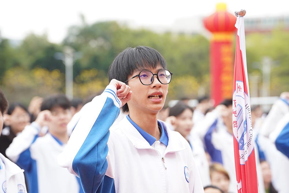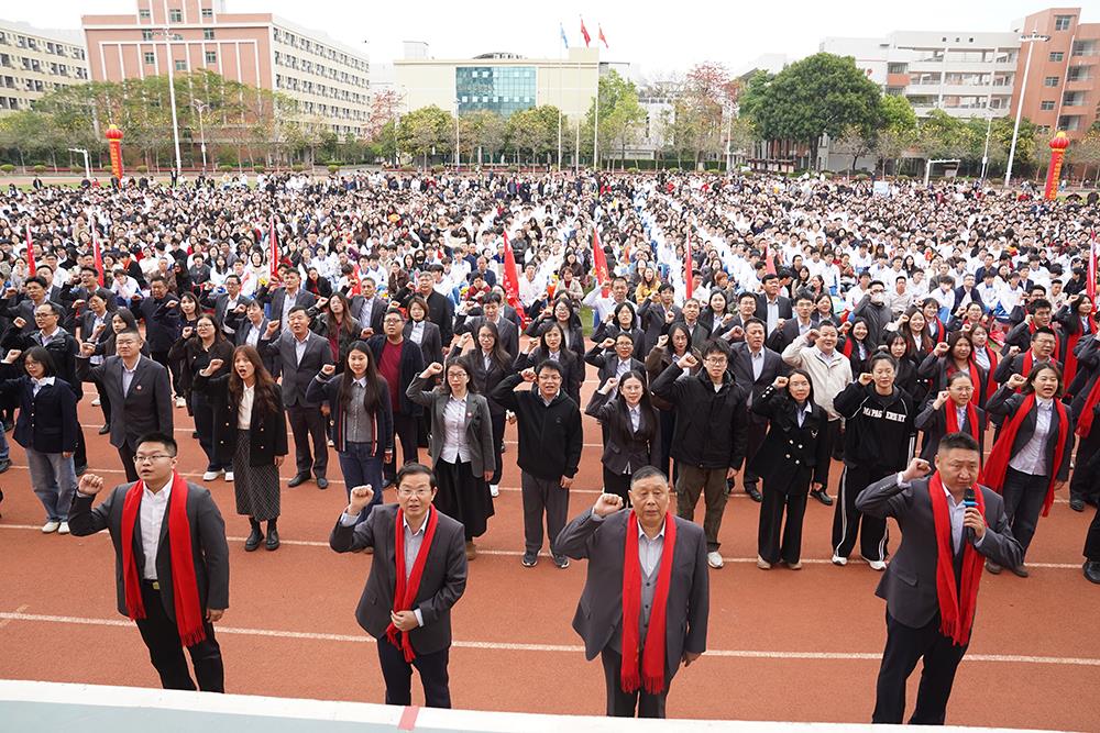 “我们郑重承诺:未来90天,以最坚定的信念迎战高考,以最昂扬的斗志攻坚克难……” 全体高三学子举起右拳,以最洪亮的声音许下誓言,彰显决胜高考的信心与决心。