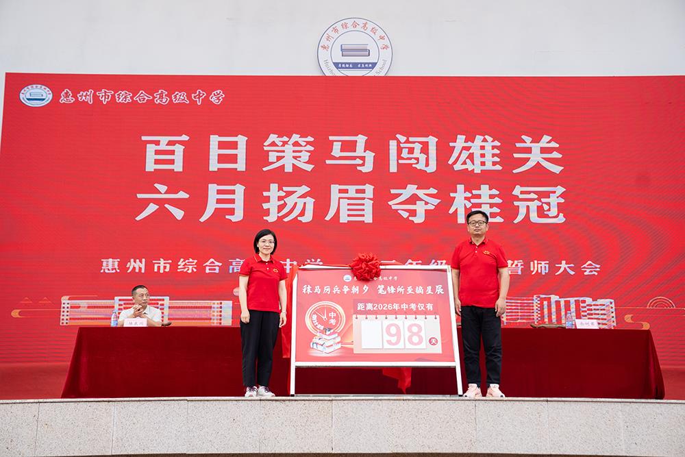 为凝聚奋进力量,坚定备考信心,激发初三学子冲刺中考的昂扬斗志,3月24日下午,惠州综合高中隆重举行2026届初三中考百日誓师大会。全体初三师生、家长代表齐聚一堂,以铮铮誓言立下百日攻坚之志,共同开启中考百日冲刺的奋进征程。