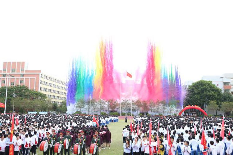 上午7时许,伴随着激昂的运动员进行曲,惠州市综合高级中学第20届田径运动会隆重开幕。操场上彩旗飘扬、鼓乐阵阵,各年级方阵依次入场,学生们身着统一的服装,精神昂扬,步伐整齐。