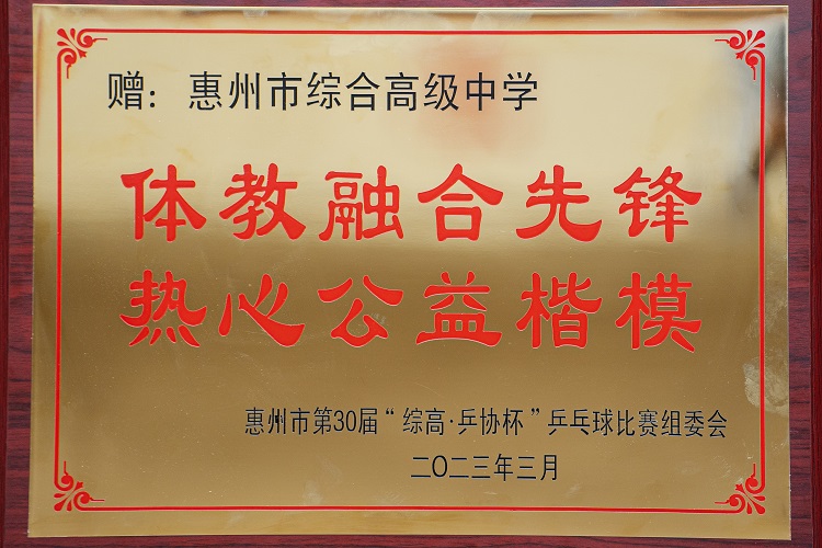 闭幕式上,惠州市乒乓球比赛组委会向我校授予“体教融合先锋 热心公益楷模”的牌匾。为了推动青少年体育事业高质量发展,我校设立特色体育课程培养乒乓球运动优秀人才,积极参与赛事引导青少年热爱体育、勇于竞技,以热心支持赛事搭建交流平台。