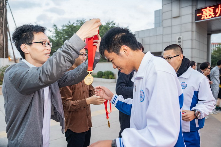 在这个特殊时刻,学校还为同学们准备了纪念金牌,希望他们在术科考场上、人生道路上勇往直前不负青春。送考老师们给每一位赴考学子戴上了沉甸甸的金牌,师弟师妹们擂响战鼓,为他们提振士气,大家齐声高喊“奥利给,加油加油”“综高必胜”!
