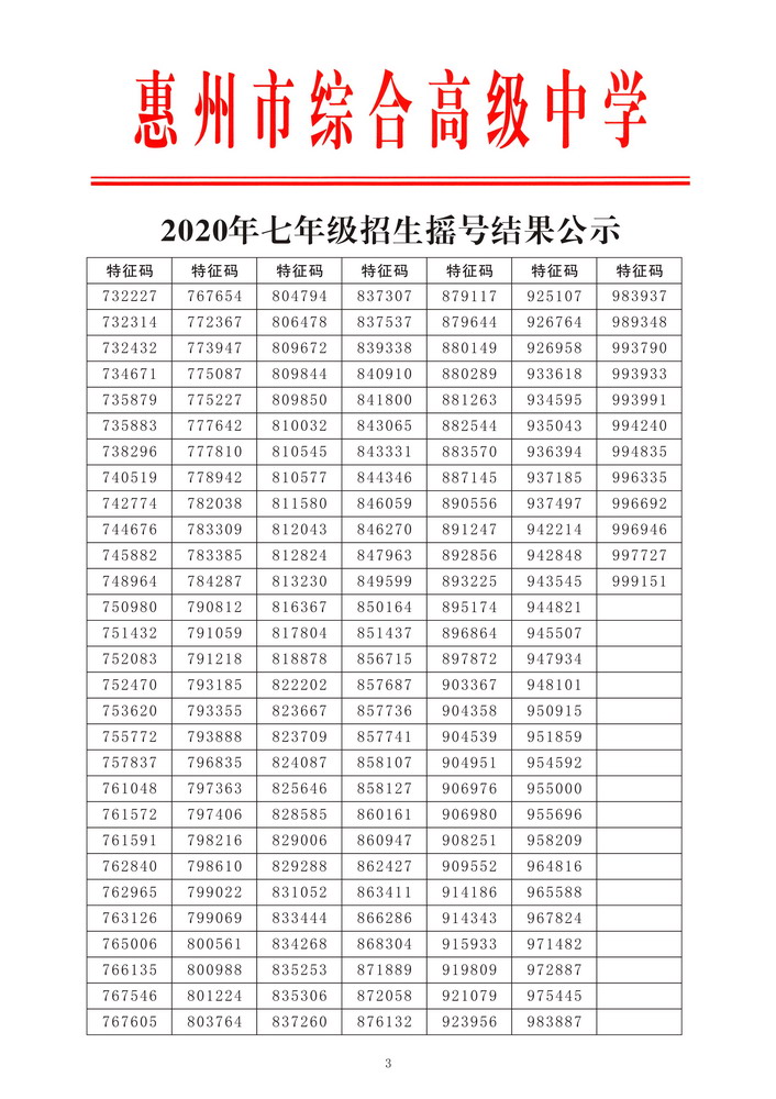 7月9日上午,惠州市2020年市直和惠城区民办学校义务教育阶段招生摇号工作顺利结束。本着公平、公开、公正的原则,现将惠州市综合高级中学2020年七年级招生摇号结果公示如下: