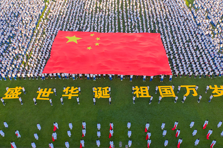 随后,同学们相互配合、默契协作,共同举起一面巨大的五星红旗,同时有序摆出“盛世华诞 祖国万岁”八个醒目大字,以青春的姿态传递对祖国的热爱,用最真挚的方式送上生日祝福。