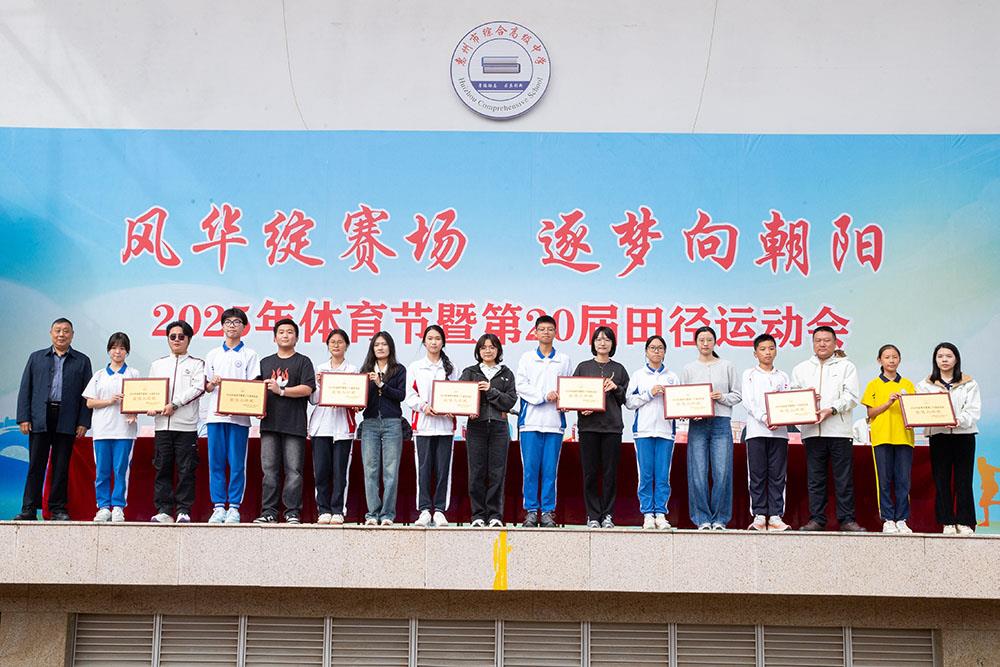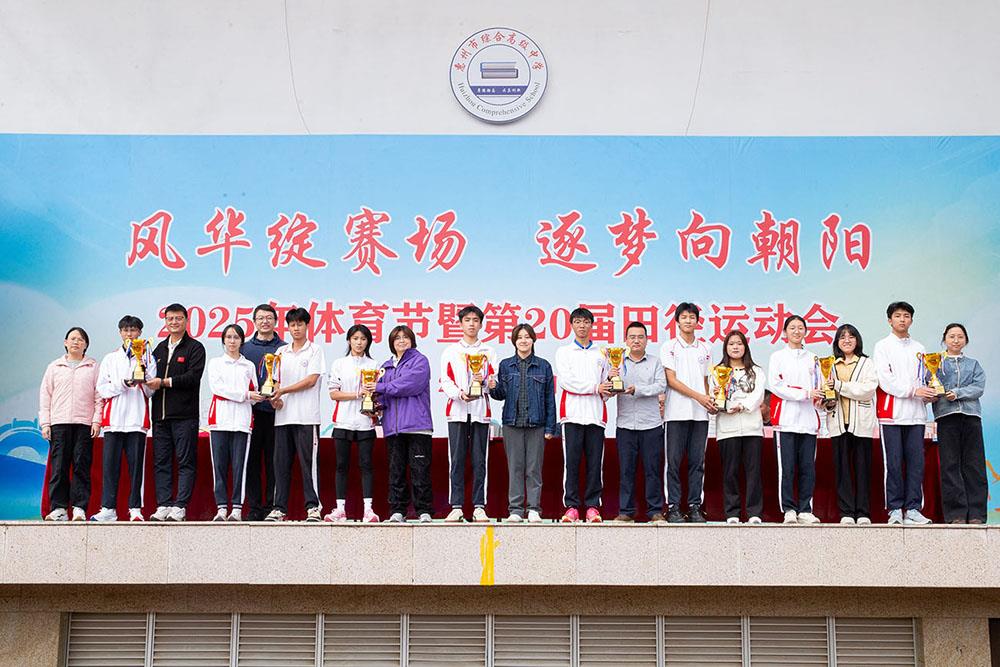 闭幕式上,校领导依次为获奖集体颁奖,表彰他们在本届运动会中的优异表现。奖项涵盖最佳团队、最佳入场式,以及初中部、高中部各年级团体总分前八名等。