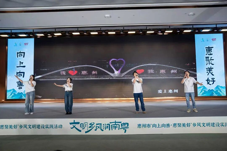 在惠州市“向上向善·惠聚美好”乡风文明建设实践活动中,我校师生代表深情演唱《爱上惠州》,将惠州的山海之景与人文之韵融入旋律,不仅唤起了现场观众的家乡自豪感,更凝聚起共建美好家园的共识。