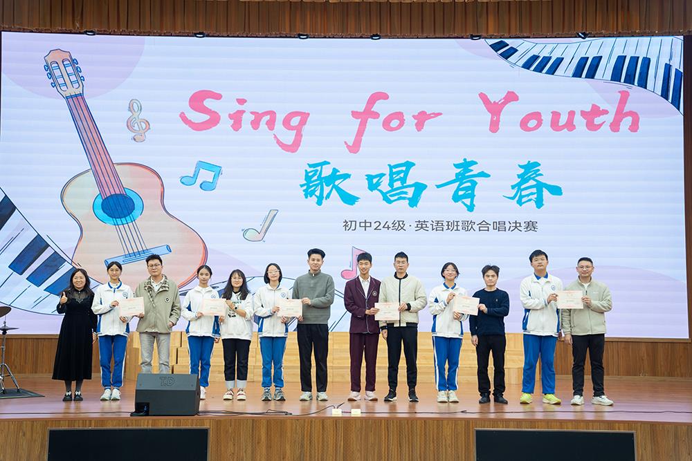 12月15日,“Sing of Youth”英文班歌合唱比赛决赛燃情开唱。有的以深情英文朗诵开篇,瞬间拉满氛围感;有的巧妙融入说唱元素,让旋律更具感染力;还有的现场奏响吉他、架子鼓等,用乐器与歌声的碰撞点燃全场。一首首经典英文歌曲饱含对梦想的执着与对生活的热爱,既展现了扎实的英文演唱功底,更彰显了各班凝聚力。
