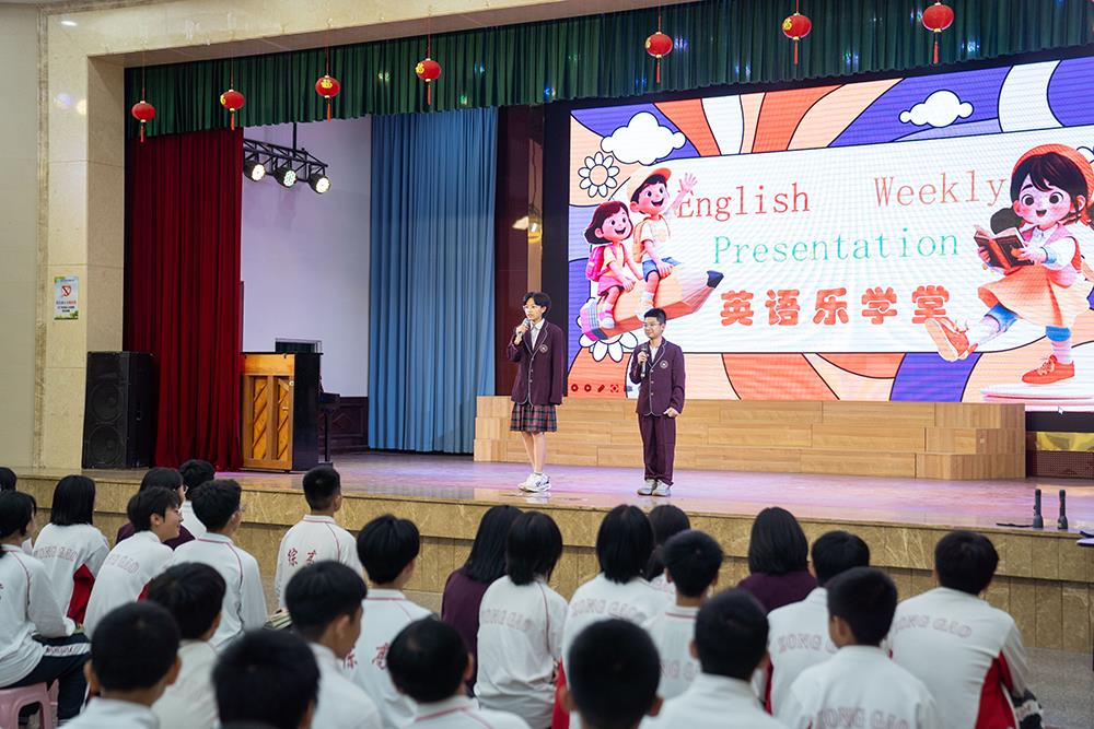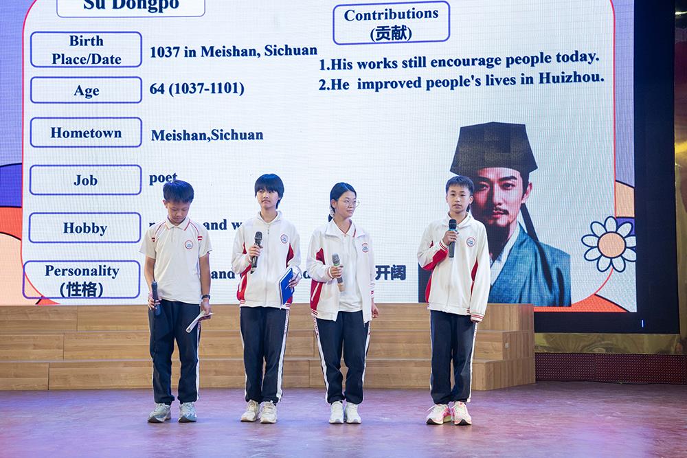 “英语乐学堂”在小礼堂开讲。老师们以惠州本土名人为切入点,精心设计教学环节,通过趣味讲解、互动问答、情景模拟等形式,引导同学们用英语介绍苏轼、叶挺等名人的生平事迹与历史贡献。课堂上,同学们积极参与、踊跃发言,在学习英语词汇、锻炼口语表达能力的同时,加深了对本土文化的了解与认同。