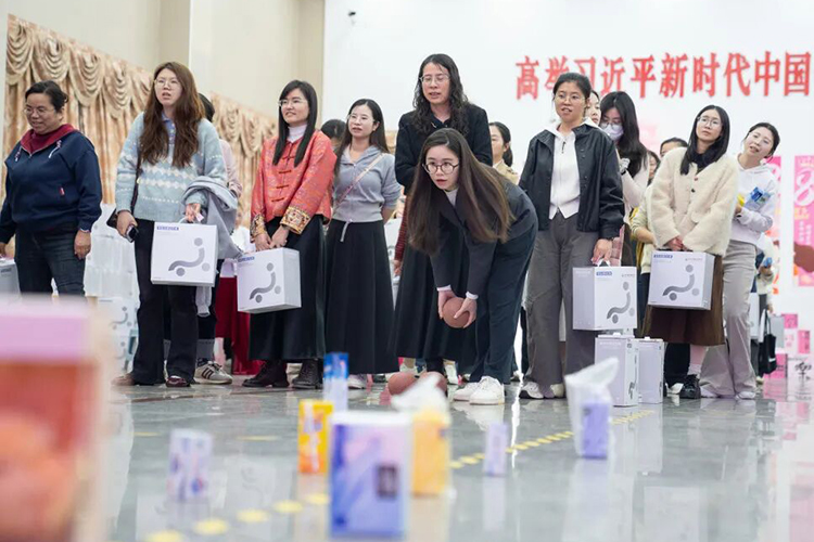 活动现场暖意融融,趣味十足。“欢乐套圈”“趣味保龄球”两大游戏区,女教职工们兴致勃勃、跃跃欲试。套圈区里,大家屏住呼吸、瞄准目标,轻轻一抛,期待着幸运降临;保龄球区中,老师们身姿舒展、稳步投掷,看着“球瓶”应声倒地,现场不时响起阵阵欢呼。